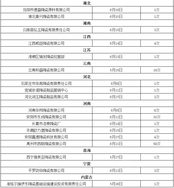7月1日,記者根據(jù)最高人民法院及各地法院發(fā)布的失信被執(zhí)行人信息,統(tǒng)計了5月11日—6月30日這51天內(nèi)全國各地被列入“失信被執(zhí)行人”的陶企,14個省份的30余家陶瓷企業(yè)被列入了“老賴”名單。
