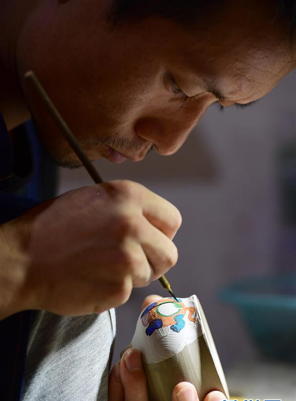 呂錫良在泥坯上進(jìn)行彩繪(8月1日攝)。新華社記者 邵瑞攝
