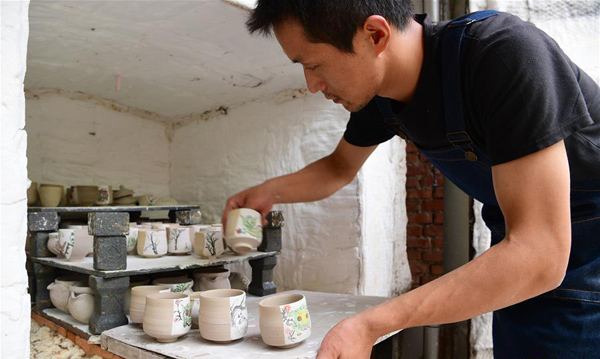 呂錫良將完成彩繪的泥坯裝窯,準(zhǔn)備進(jìn)行素?zé)?月1日攝)。 新華社記者 邵瑞攝