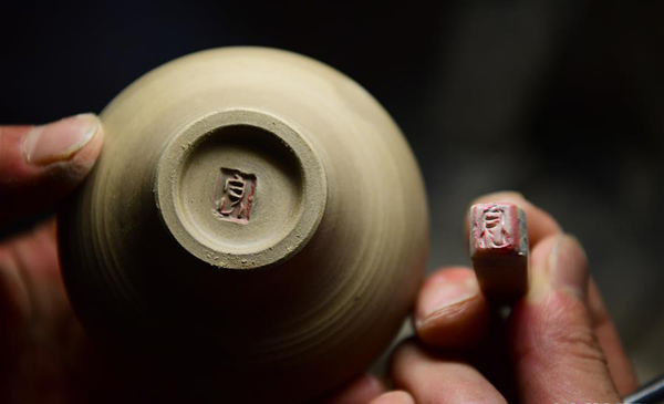 呂錫良在一只泥坯的底部蓋上印章(8月1日攝)。 新華社記者 邵瑞攝
