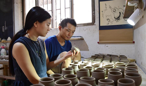 8月15日,呂錫良(左)與黃俊玲查看完成燒制的陶瓷制品。新華社記者 邵瑞攝