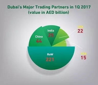 中國(guó)繼續(xù)保持迪拜最大貿(mào)易合作伙伴地位,貿(mào)易額441.5億迪拉姆,占迪拜總對(duì)外貿(mào)易額13.5%;印度以254億迪拉姆緊隨其后,占7.8%;美國(guó)以220億迪拉姆(占6.7%)位居第三。