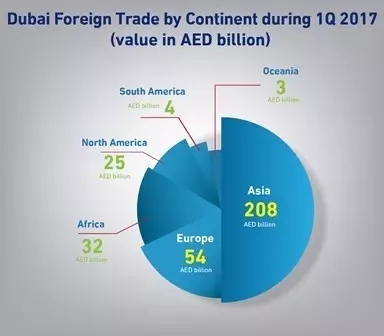 從地區(qū)分布來看,亞洲依舊是迪拜最大的貿(mào)易市場(chǎng),一季度貿(mào)易額2080迪拉姆;歐洲和北美洲分列二、三位,貿(mào)易額分別為540億迪拉姆和250億迪拉姆;南美洲40億迪拉姆,大洋洲30億迪拉姆。