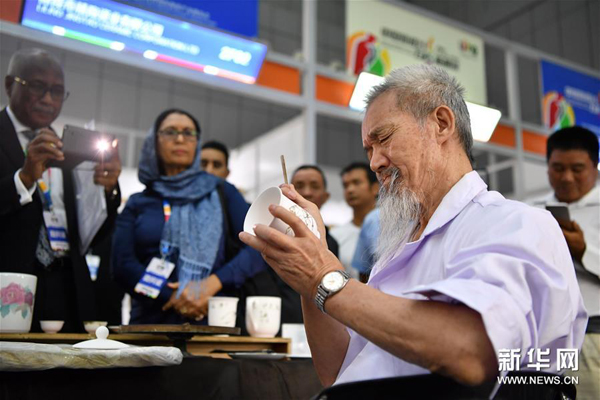 9月28日,參加博覽會(huì)的湖南醴陵的陶瓷匠人在陶坯上繪畫。新華社發(fā)(薛宇舸 攝)