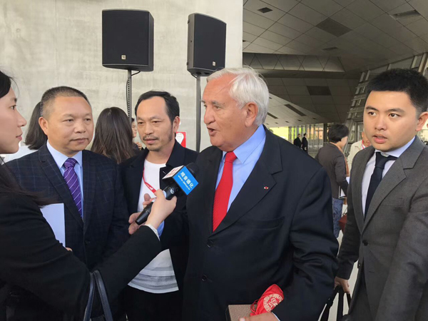 “中國白”國際陶瓷藝術(shù)大賽頒獎結(jié)束后法國前總理拉法蘭接受德化電視臺采訪
