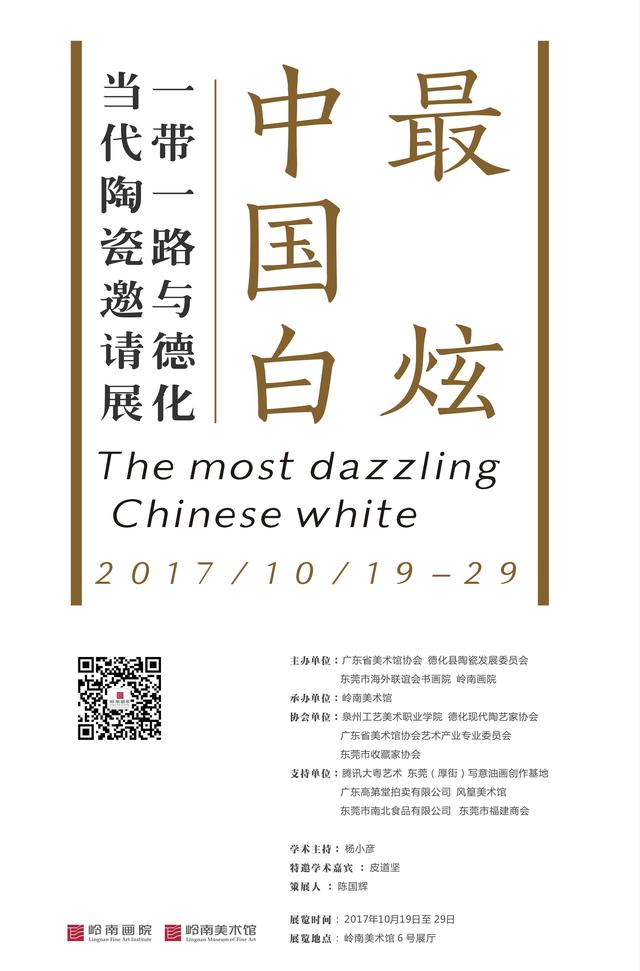 2017年10月19日,由廣東省美術(shù)館協(xié)會(huì)、德化縣陶瓷發(fā)展委員會(huì)、東莞市海外聯(lián)誼會(huì)書(shū)畫(huà)院、嶺南畫(huà)院主辦;嶺南美術(shù)館承辦的最炫中國(guó)白——“一帶一路”與德化當(dāng)代陶瓷邀請(qǐng)展將在嶺南美術(shù)館開(kāi)幕。