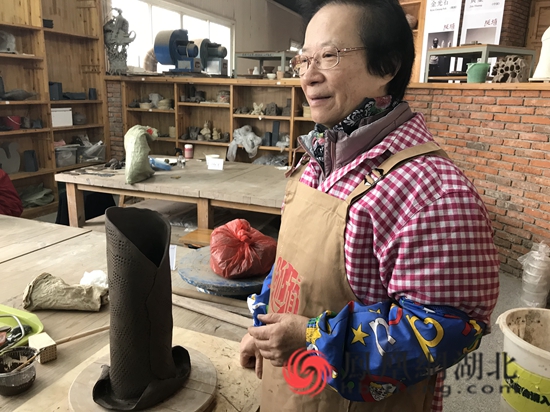 “現(xiàn)在年紀大了嘛,只能用盤條的形式做陶藝了。”今年70歲的黃美莉老師來自中國香港特別行政區(qū),做采訪時她正在創(chuàng)作手中的泥板卷桶,大塊的陶土對于現(xiàn)在的黃老師老說體力上有點吃不消,才用盤條的方式會相對輕松一些,“年輕的時候我住在英國,隔壁鄰居是一位藝術(shù)家,我那時候經(jīng)常去他們家里玩,之后就跟著他學(xué),后來回到香港,也去了很多地方學(xué),到現(xiàn)在做陶有四十多年了。”黃老師告訴我們,跟武漢的緣分從十二年前就開始了,“十二年期我來武漢教學(xué)生們雕塑,這一次來感覺這里發(fā)展的很快,設(shè)備、環(huán)境都有了很大的改善。”