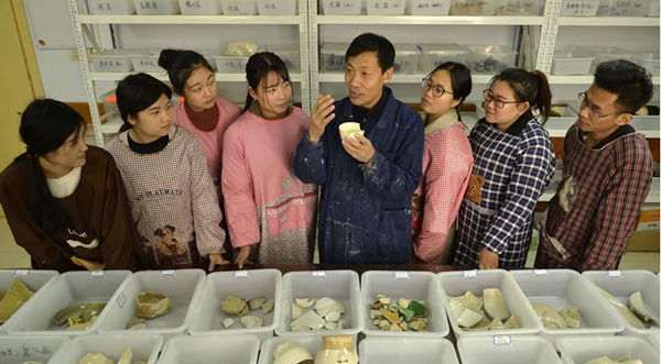 11月29日,在邢臺學院陶瓷藝術(shù)實驗室,非遺代表性傳承人張志忠(左一)為大學生演示邢窯白釉罐制作技藝。