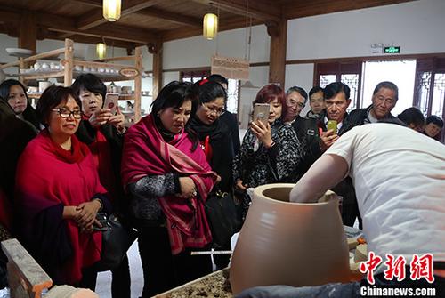 海外華文教育學(xué)校校長(zhǎng)在觀看景德鎮(zhèn)傳統(tǒng)的手工制瓷技藝!⒄祭ァz