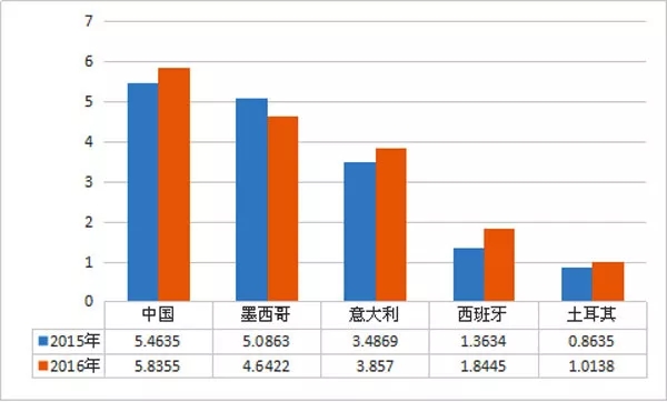 2015~2016年美國瓷磚進口前五國情況