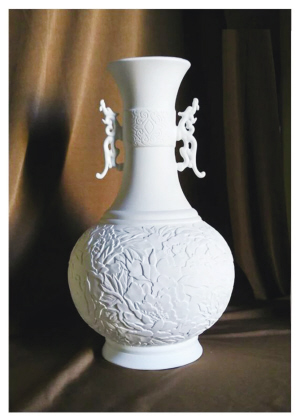 骨質(zhì)瓷《清花新語(yǔ)》雕刻橄欖瓶,2015年獲得第三屆中國(guó)陶瓷名家名作展銀獎(jiǎng)