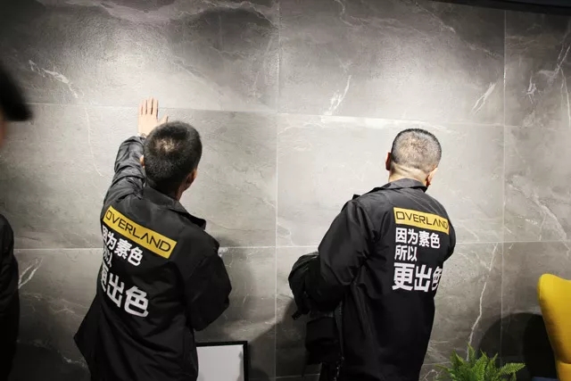 ▲圖為歐文萊經(jīng)銷商現(xiàn)場感受歐文萊素色現(xiàn)代磚新品“灰印象”產(chǎn)品表面觸感。