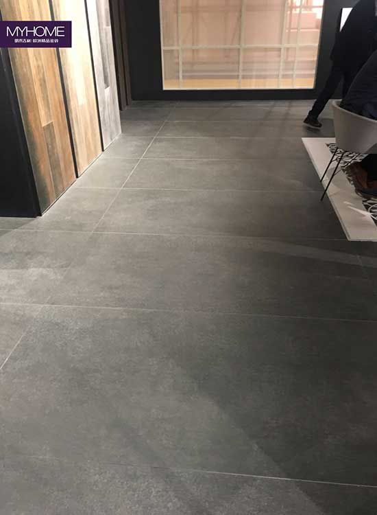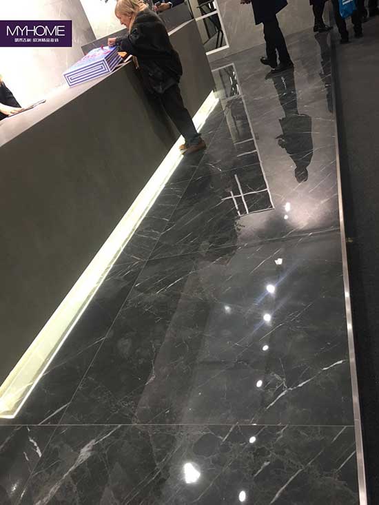 展廳咨詢臺(tái)前的地面由 120×120cm 大規(guī)格方磚鋪成,就象黑色的緞面上撒了一層銀燦燦的綢帶,給人一種穩(wěn)重和高貴的感覺(jué),大面積鋪貼體現(xiàn)出其特有的富麗堂皇。