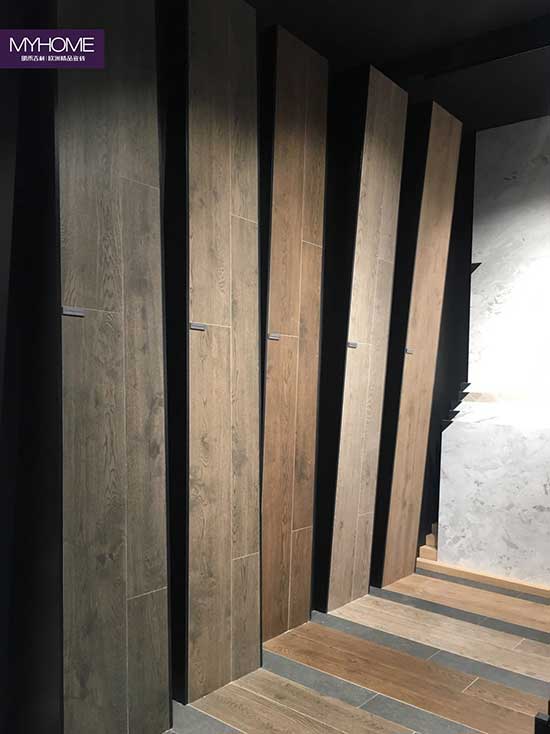 在原木木紋瓷磚展區(qū),PAMESA 隆重推出了 22.5×180cm 與 30×180 cm 兩種規(guī)格新品,5 種顏色由淺至深能實(shí)現(xiàn)不同樹種紋路及色澤的特點(diǎn)。不僅表面花紋與木地板相似,就連整體尺寸也幾乎相近,因此給人感覺(jué)更真實(shí)。