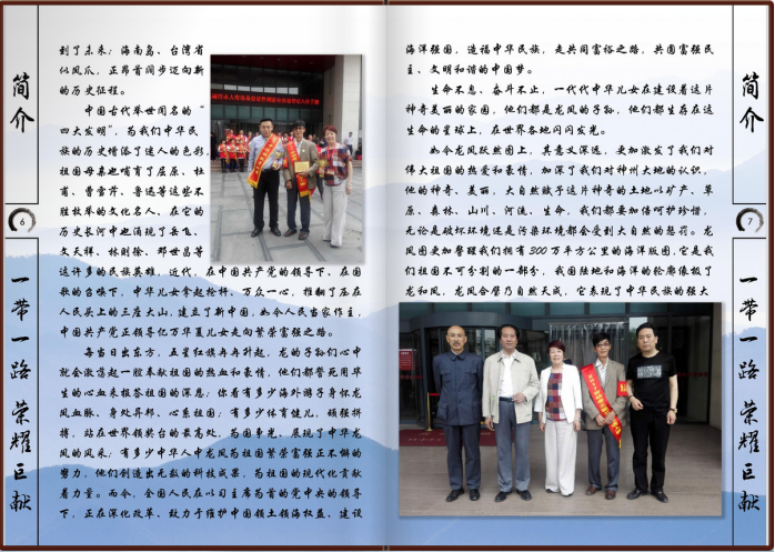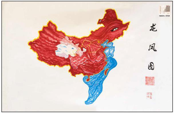 陳志國,男,回族,1957年10月生,F(xiàn)任職于寧夏平羅縣中醫(yī)院。其在中國地圖上發(fā)現(xiàn),沿中國海岸線的海洋地形像條巨龍,于是產(chǎn)生了在地圖上作畫的創(chuàng)意。在圖上渤海處的海洋地形像龍的頭;用黃色線條沿中國海岸線描繪出龍的皮膚;中國的海洋版圖和海島等島嶼看作為龍的身體和腹臟;龍的眼位于長城的“天下第一關(guān)”和北戴河相連,眼睛為“老龍頭”,一只爪位于杭州灣處,從南匯至“天童寺”,爪尖位于錢塘江口(崇明島、舟山群島為龍爪的骨節(jié));龍的后爪位于廣東省大亞灣至珠江口、南至澳門,爪尖在廣州市;另一只爪是珠江入?凇陌拈T至崖門,爪尖位于佛山。這樣整體的中國海洋地形輪廓,猶如東方巨龍騰飛。同時中國陸地地形向一只飛舞的鳳凰;鳳眼位于哈爾濱,在地圖上祖國的心臟北京猶如一只璀璨的“龍珠”位于龍頭上方;在地圖上黃河入海口恰在龍口處,仿佛巨龍在吸著鳳的乳汁;黃河、長江整體為鳳翅;臺灣省、海南省如鳳爪。同時,向人們展示了龍鳳圖騰,美麗中國!山東水墨丹青藝術(shù)中心.