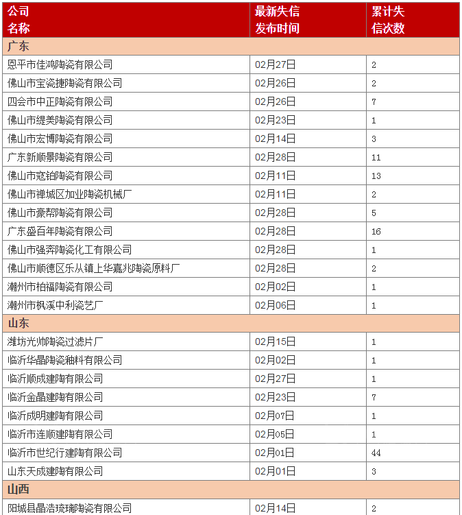 3月1日,記者根據(jù)最高人民法院及各地法院發(fā)布的失信被執(zhí)行人信息統(tǒng)計,2018年2月份有40余家陶企被列入“失信被執(zhí)行人名單”。據(jù)悉,2月份的名單涉及15個省(市),廣東省失信陶企最多,高達14家。