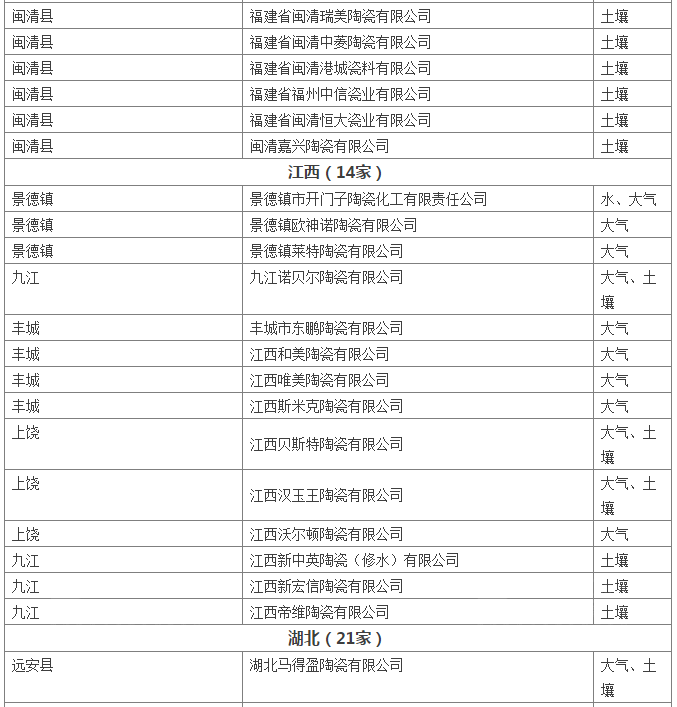 近期,各省市陸續(xù)公布了2018年度重點(diǎn)排污單位名錄,記者統(tǒng)計(jì)發(fā)現(xiàn),目前已經(jīng)有100多家陶企被列入了2018年度重點(diǎn)排污單位名錄,其中廣東江門有15家(資訊|15家陶瓷廠上了2018年江門重點(diǎn)排污單位名錄),四川省有30家(30余家陶企被列入2018四川省重點(diǎn)排污單位名錄),而福建、江西、湖北、廣西、河南、陜西等6省有112家陶企被列入了“2018年度重點(diǎn)排污單位名錄”。