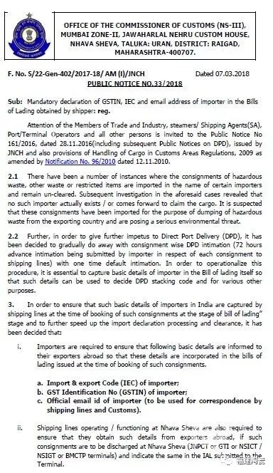 2018年4月1日開(kāi)始,印度海關(guān)將實(shí)施新的通關(guān)要求,外貿(mào)貨代企業(yè)需嚴(yán)格執(zhí)行,否則貨物運(yùn)抵目的港后將無(wú)法清關(guān),同時(shí)面臨海關(guān)處罰!