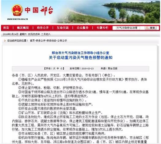 3月23日0時,河北邢臺啟動重污染天氣橙色預警,在執(zhí)行《2018年3月份大氣污染綜合治理攻堅月行動方案》的基礎上,按照《邢臺市重污染天氣應急預案》及補充說明實施Ⅱ級應急響應措施。
