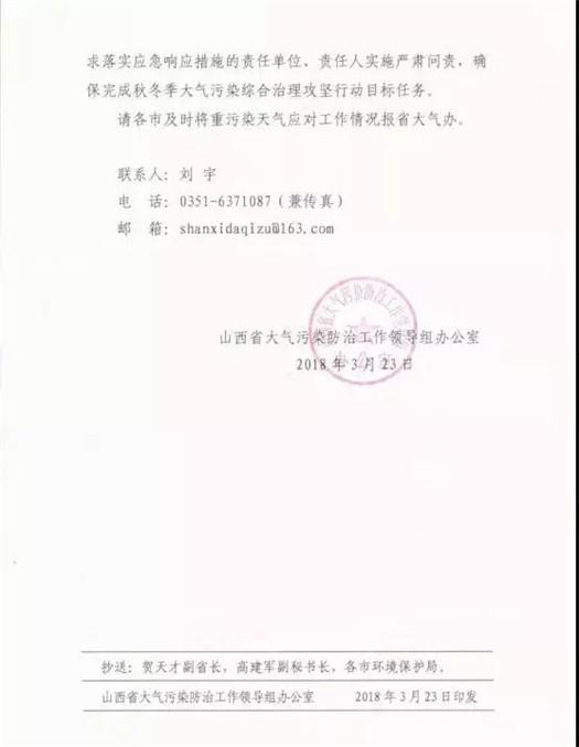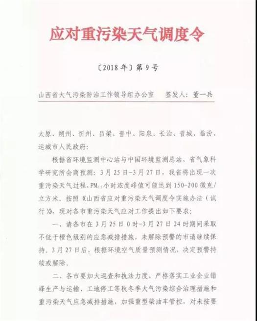 山西省大氣污染防治工作領導組辦公室3月23日發(fā)布了今年第9號應對重污染天氣調度令,要求除大同外各市于3月25日0時-3月27日24時期間,積極應對重污染天氣過程。