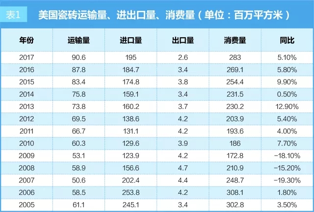 數(shù)據(jù)顯示,2017年,美國(guó)瓷磚產(chǎn)量、消費(fèi)量、進(jìn)口量繼續(xù)增長(zhǎng)。其中,瓷磚產(chǎn)量達(dá)創(chuàng)記錄的9600萬平方米,上漲了3.2%;瓷磚消費(fèi)量達(dá)2.83億平方米,增長(zhǎng)了5.1%;瓷磚進(jìn)口量達(dá)1.95億平方米,增長(zhǎng)了5.6%。值得注意的是,中國(guó)仍是美國(guó)進(jìn)口瓷磚第一大來源國(guó),全美消費(fèi)的超1/5的瓷磚來源于中國(guó)。