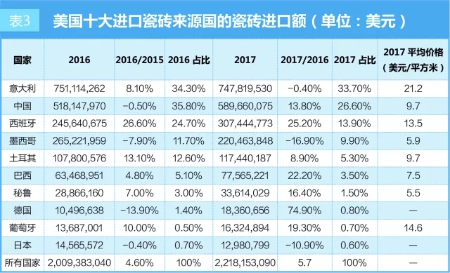 2017年,美國(guó)進(jìn)口瓷磚(含關(guān)稅、運(yùn)費(fèi)和保險(xiǎn))的平均價(jià)格穩(wěn)定在1.06美元/平方英尺(約合11.4美元/平方米)。從表3可以看出,在美國(guó)十大進(jìn)口瓷磚來源國(guó)的平均價(jià)格中,意大利瓷磚的進(jìn)口平均單價(jià)依舊位列第一,高達(dá)21.2美元/平方米。其次是葡萄牙和西班牙。而中國(guó)瓷磚的進(jìn)口平均單價(jià)和土耳其相當(dāng),僅為9.7美元/平方米。