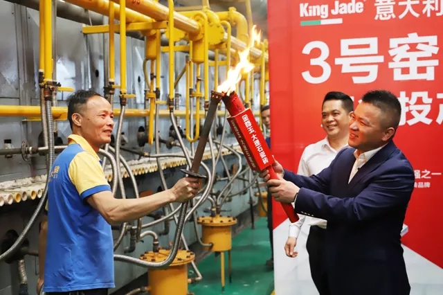 2018年3月28日9:18分,金尊玉大理石瓷磚佛山西樵生產(chǎn)基地。在行業(yè)媒體、全體生產(chǎn)員工的共同見證下,金尊玉大理石瓷磚董事長(zhǎng)南順芝高舉火炬,點(diǎn)燃3號(hào)窯爐的熊熊窯火。