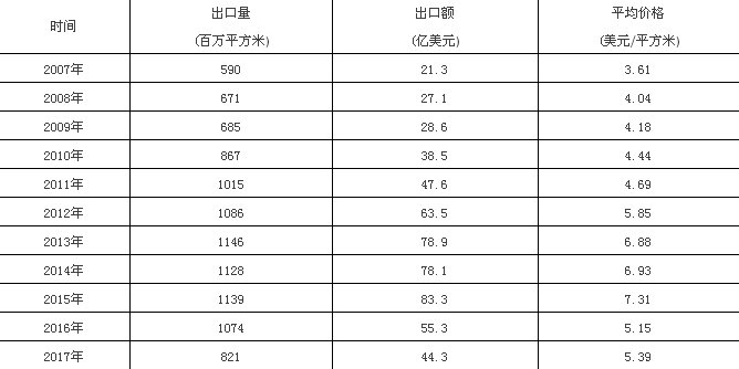 表4:2007年-2017年全國(guó)陶瓷磚出口統(tǒng)計(jì)