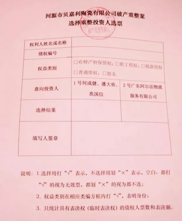 2018年3月20日,河源貝嘉利陶瓷有限公司破產(chǎn)重整管理人向債權(quán)人、股東、職工、法定代表人發(fā)出通知:定于4月11日(昨日)在河源市中級人民法院召開破產(chǎn)重整案第三次債權(quán)人會議,將通過現(xiàn)場競爭的方式由債權(quán)人會議選定重整投資人。