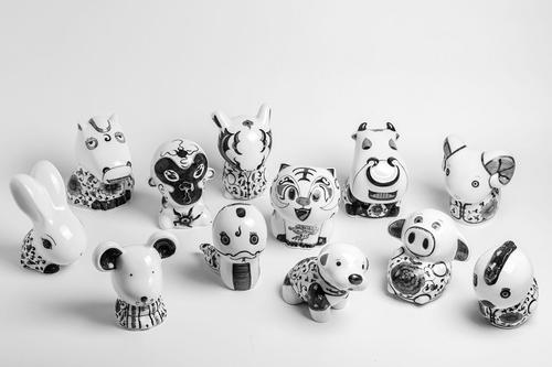 在郭超所做的這套十二生肖陶瓷中,他將這二者進(jìn)行了完美結(jié)合,以公仔元素為切入點(diǎn),將傳統(tǒng)的纏枝紋作為衣飾紋樣,以青花料描繪在動物瓷雕上,再配以代表富貴吉祥的牡丹花。十二個(gè)小動物全都穿上了頗具“中國風(fēng)”的衣服,看起來別有一番韻味。