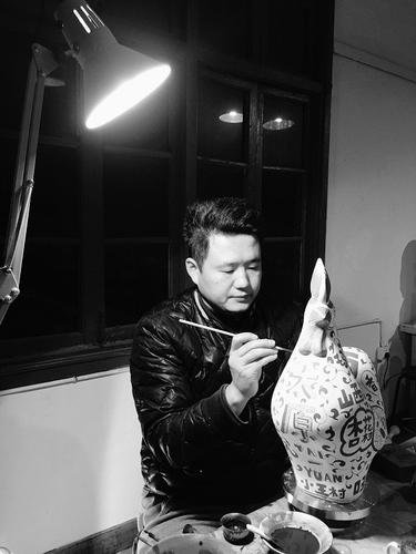 與此同時(shí),他也在不斷學(xué)習(xí),報(bào)名參加各種培訓(xùn)班。2015年,參加中央文化管理干部學(xué)院“文化部文化產(chǎn)業(yè)創(chuàng)意人才培訓(xùn)班”;2016年,參加景德鎮(zhèn)陶瓷大學(xué)《中國非物質(zhì)文化遺產(chǎn)傳承人群研修研習(xí)培訓(xùn)計(jì)劃》研修班;2017年參加國家藝術(shù)基金《景德鎮(zhèn)民間青花瓷技藝傳承與創(chuàng)新人才培養(yǎng)》高級研修班……郭超說,他的目標(biāo)就是在學(xué)習(xí)中提升自己,然后去做出一些更符合時(shí)代、更符合年輕人氣質(zhì)的作品。
