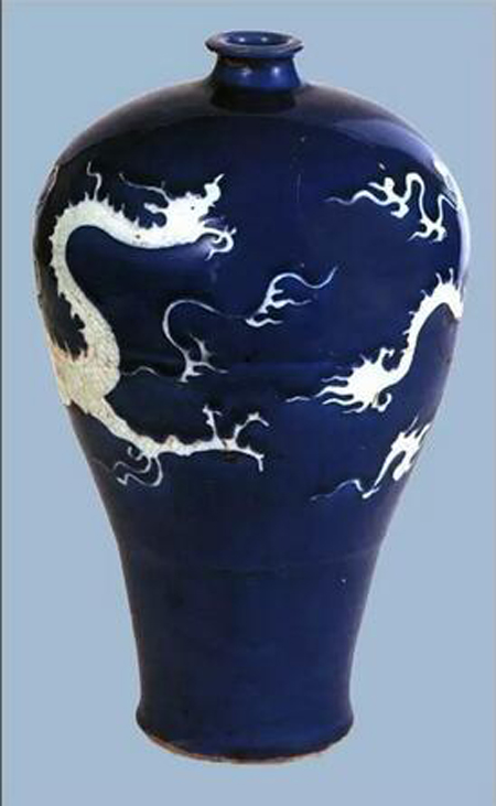 高溫鈷藍(lán)釉瓷器是以鈷作為著色元素,元代創(chuàng)燒的新品種,為明、清祭(霽)藍(lán)、灑藍(lán)等藍(lán)釉瓷器奠定了基礎(chǔ)。裝飾上或飾以描金,或飾以白龍、白鳳等紋飾,兼以刻、劃花工藝。傳世有梅瓶、盤、匜等器型。