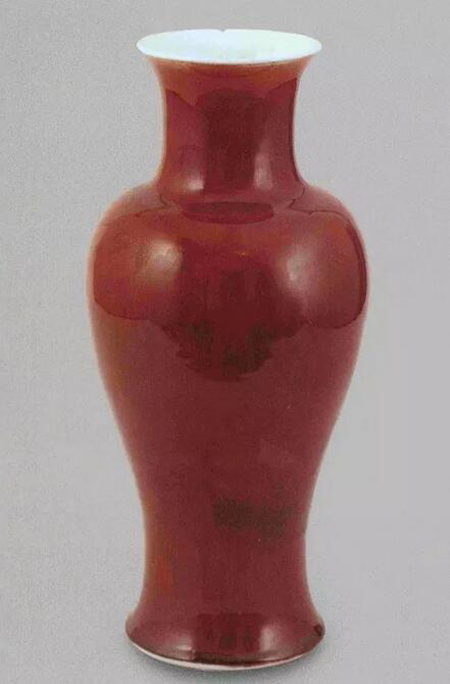 郎窯紅釉是康熙晚期景德鎮(zhèn)仿燒明代永樂(lè)、宣德時(shí)期鮮紅釉瓷器而產(chǎn)生紅釉新品種?滴跛氖哪曛廖迨荒,江西巡撫兼景德鎮(zhèn)御窯廠督理主持窯務(wù),由于清代官窯瓷器常以督陶官姓氏冠以窯名,所以在郎廷極為督陶官期間創(chuàng)燒的紅釉新品種,稱為郎窯紅釉。郎窯紅釉瓷器,以氧化銅為著色劑,生坯掛釉,入窯經(jīng)1300℃高溫再還原氣氛中一次燒成。郎窯紅釉瓷器造型以瓶、尊為主,尤以觀音尊最有特色,釉色鮮紅,顏色隨垂流逐漸加深,釉面清亮,玻璃質(zhì)感較強(qiáng),釉面有開(kāi)片、鬃眼和牛毛細(xì)紋,口部釉薄露出胎骨白色,紅釉垂流通常不過(guò)底足,有“脫口垂足郎不流”之說(shuō),底足為“米湯底”或“蘋果綠底”,偶見(jiàn)紅釉底,一般不署款識(shí)。