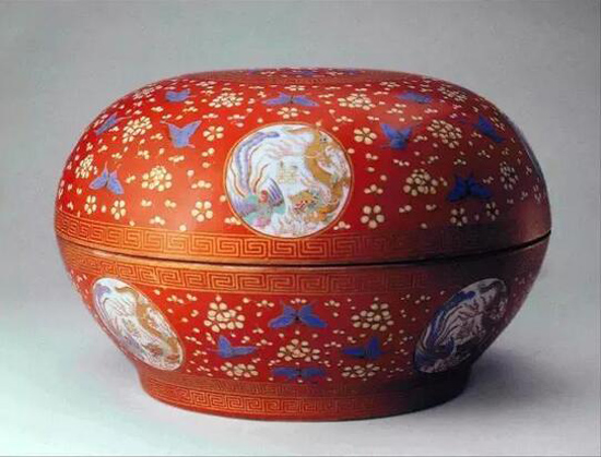 頤和園藏同治紅地粉彩開(kāi)光龍鳳紋捧盒