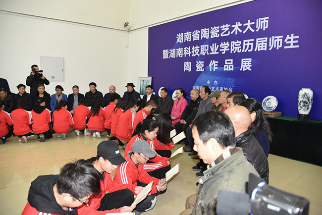拜師儀式上,鄧江晨和同學(xué)們向大師們敬茶,還宣讀了“拜師貼”,承諾將“謹(jǐn)遵師教,刻苦鉆研,弘揚(yáng)湘瓷文化,傳承匠心精神”。