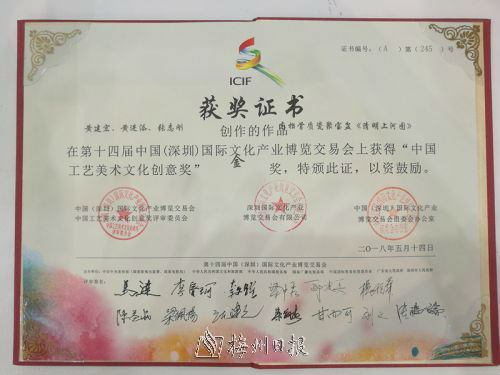 記者昨日從深圳文博會組委會了解到,由廣東大埔縣怡豐園公司選送的青花骨質(zhì)瓷“聚寶盆”《清明上河圖》,在第十四屆深圳文博會上獲得“中國工藝美術(shù)文化創(chuàng)意獎”金獎。