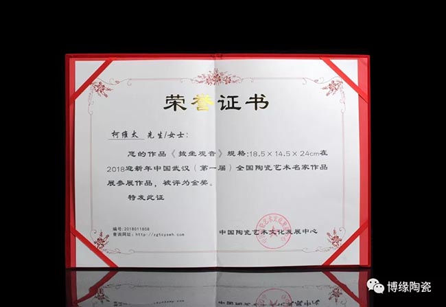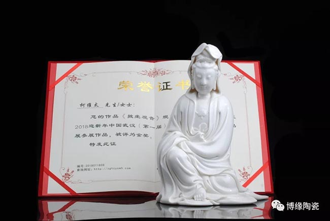 近日,由中國陶瓷藝術(shù)發(fā)展中心主辦的2018迎新年中國武漢(第一屆)全國陶瓷藝術(shù)名家作品展評選結(jié)果揭曉,我司作品《披坐觀音》榮獲金獎(jiǎng)。