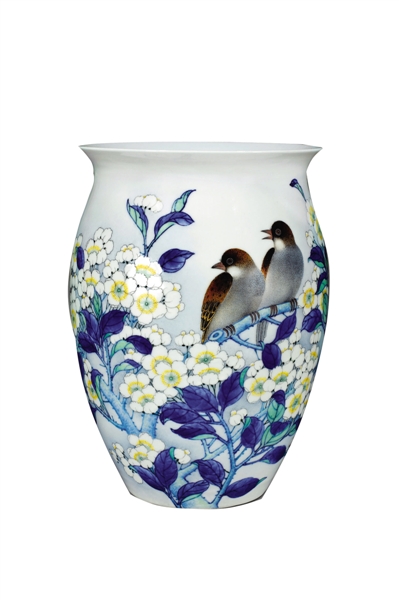 對(duì)于彩繪的熱愛(ài),嵇錫貴總有著一種超乎尋常的情結(jié);對(duì)創(chuàng)作美的渴求,促使她在釉上彩繪中盡情展現(xiàn)自己的才華。她作品中的每一根線條、每一處渲染、每一個(gè)色塊都刻畫(huà)精微,呈現(xiàn)出生動(dòng)的氣韻。她根據(jù)創(chuàng)作需要,巧妙地把技法有目的地運(yùn)用組合,使作品具有更強(qiáng)的表現(xiàn)力。比如在釉下彩創(chuàng)作中,嵇錫貴將彩繪與刻花結(jié)合,通過(guò)色彩對(duì)比形成強(qiáng)烈的視覺(jué)沖擊力,她創(chuàng)作的越窯青瓷刻花,在傳統(tǒng)中彰顯出現(xiàn)代的氣息。