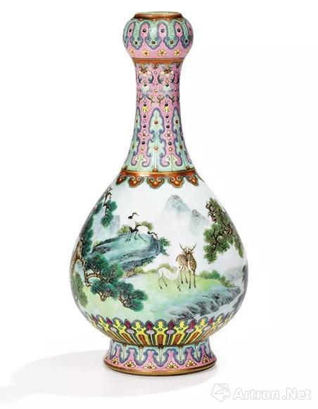 本瓶極其珍罕,屬于孤例,制于乾隆景德鎮(zhèn)御窯。該時(shí)期之洋彩瓷器極鮮見(jiàn)于市場(chǎng),大部份藏于臺(tái)北國(guó)立故宮博物院及世界各地其它博物館。如此珍品現(xiàn)身拍場(chǎng),必見(jiàn)藏家爭(zhēng)相追捧:今年四月,香港蘇富比上拍一件粉紅地琺瑯彩盌,以2.39億港元(約2,170萬(wàn)英鎊)成交。