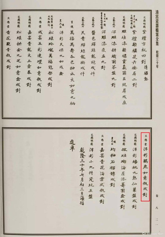 據(jù)《清宮瓷器檔案全集》記載,僅兩例洋彩鶴鹿圖如意瓶。乾隆三十年,太監(jiān)海福送一對(duì)此等瓶往佛堂。乾隆三十四年,命御窯制兩瓶為賀壽禮品 。