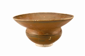 北宋定窯醬釉瓷渣斗(圖2),高9、口徑18.5、底徑6厘米,為碗口鼓腹罐的復(fù)合體。碗(圖3)為大敞口,斜弧腹;罐為扁鼓腹,淺圈足。渣斗為衛(wèi)生用具,用于盛裝唾吐物,也用于酒宴上盛放肉骨魚(yú)刺等食物渣滓,與唾壺相似,當(dāng)為唾壺演變而來(lái)。其實(shí)用性在保持原有的功能的同時(shí),兼有茶器的功用。2006年至2009年,陜西省考古研究院、西安市文物保護(hù)考古研究所對(duì)藍(lán)田縣五里頭村北宋呂氏家族墓進(jìn)行發(fā)掘,出土了數(shù)十件渣斗,在一件銅質(zhì)的渣斗內(nèi)發(fā)現(xiàn)殘留的茶葉,從而推斷,這件銅質(zhì)渣斗是一件茶器,是用來(lái)盛放茶渣的。