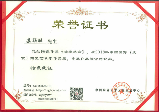 2018年6月,作品《披坐觀音》榮獲2018年中國國際(北京)陶瓷藝術(shù)家作品展評比金獎;