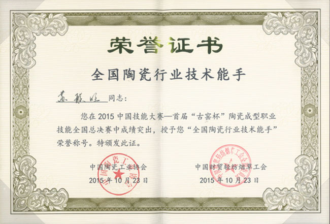 蘇聯(lián)旺榮獲2015中國技能大賽“全國陶瓷行業(yè)技術(shù)能手”榮譽(yù)稱號