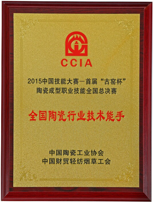 2015年10月,作品《中國夢》在2015中國技能大賽——首屆“古窯杯”陶瓷成型職業(yè)技能全國總決賽中榮獲“全國陶瓷行業(yè)技術(shù)能手”榮譽(yù)稱號;