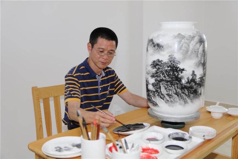今年54歲的黃建宏是大埔縣高陂鎮(zhèn)人,這里是廣東四大陶瓷產(chǎn)區(qū)之一,早在商周時期就開始陶器生產(chǎn)制作,制瓷業(yè)發(fā)展距今已有800多年歷史,享有“中國青花瓷之鄉(xiāng)”“南國瓷都”“陶瓷之鄉(xiāng)”“白玉城”等美譽。在濃郁的陶瓷文化熏陶下,黃建宏自幼愛好陶瓷藝術(shù),1979年高中畢業(yè)后跟隨當?shù)乩纤嚾藢W(xué)習(xí)陶瓷創(chuàng)作設(shè)計,在白胎上彩繪創(chuàng)作。“我沒接受過正規(guī)的繪畫藝術(shù)教育,彩繪技藝都是老師傅手把手教出來的。”黃建宏告訴記者,在傳統(tǒng)中學(xué)習(xí),在工藝中苦練,正是在師徒傳承中,他慢慢領(lǐng)悟了“泥巴”變藝術(shù)的神奇之處,也迷上了這項傳承千年的職業(yè)。