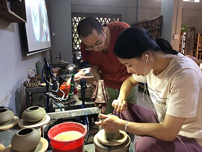 賴通發(fā)正在指導(dǎo)學(xué)生制作手拉壺。