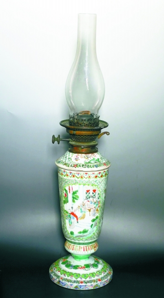 “外銷瓷是征服世界的藝術(shù)外交瓷,促進(jìn)了中西方經(jīng)濟(jì)、科技、藝術(shù)的進(jìn)步和交融。”在收藏的外銷瓷中,關(guān)海森特別偏愛一種特殊的品類——定制器。他認(rèn)為,定制瓷是東方工藝與西方文明的激烈碰撞,在碰撞中互相學(xué)習(xí)、融合、共生。多年運(yùn)用高科技光學(xué)儀器從事古玩鑒定的工作,讓關(guān)海森對(duì)“燈”有著特殊的感情。在他收藏的陶瓷燈具中,有一盞清代的五彩陶瓷油燈較為特殊,屬于典型的定制外銷瓷器。設(shè)計(jì)者充分利用陶瓷、金屬、玻璃等不同材料的特性,把東方的陶瓷之美與西方的機(jī)械工藝巧妙地結(jié)合。油燈高60厘米,由燈座、油倉(cāng)、燈盤、燈罩四部分組成。燈座用陶瓷做成獎(jiǎng)杯的形狀,厚重高大的陶瓷燈座穩(wěn)固、安全。燈座的杯口內(nèi)安插一只以斜肩為沿的短柱形陶瓷油倉(cāng),口部鑲嵌銅箍,用來儲(chǔ)存燃油。