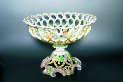 “自古以來玲瓏瓷、脫胎瓷是陶瓷燒制工藝中難度最大的,常見的玲瓏瓷器在制作時(shí)往往‘肉’大于‘漏’,也就是挖掉的鏤空部位要比留下的坯體體積小。而這對(duì)果盤恰恰相反,而是‘漏’大于‘肉’。”關(guān)海森說,這對(duì)玲瓏瓷果盤非常罕見,不但工藝精美細(xì)致,設(shè)計(jì)也非常大膽,是西方美學(xué)觀念與東方審美情趣巧妙的交融。