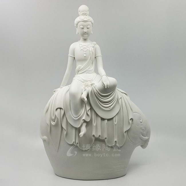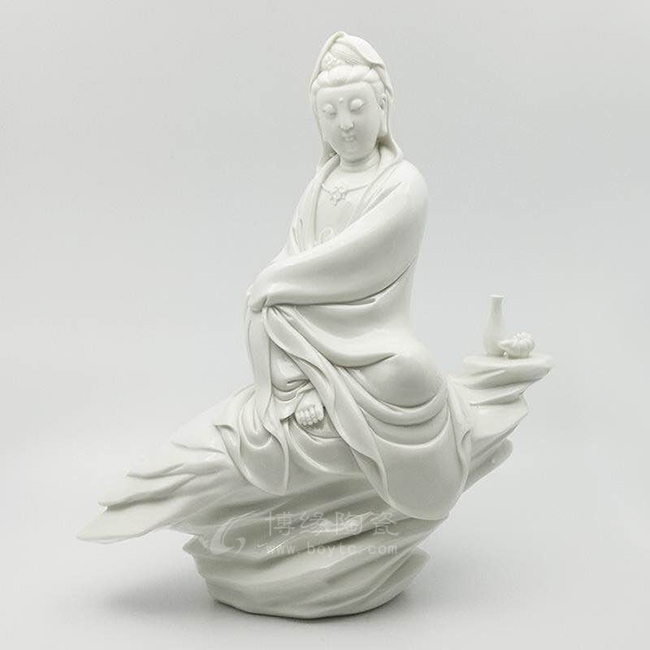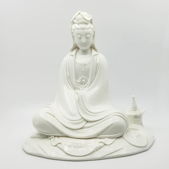 德化白瓷所塑佛像有性格鮮明、造型優(yōu)美、神態(tài)逼真、風(fēng)格洗練的特點(diǎn)。有一種單純的雕塑美和原材料的質(zhì)地美,最能體現(xiàn)佛教樸素、平和的思想。早在明代德化白瓷佛像就名聲在外,一代“瓷圣”何朝宗佛像名作流傳后世,成為世界各大博物館收藏的珍品,更對佛像雕塑史上產(chǎn)生深遠(yuǎn)的影響,形成“何派”雕塑,其開創(chuàng)的捏、塑、雕、刻、刮、削、接、貼八字技法延用至今。何派觀音雕塑注重于細(xì)節(jié)之美,精益求精,故而十分著意衣紋的刻畫,使線條流暢,翻轉(zhuǎn)自然。觀其佛像,仿佛有春風(fēng)拂面,衣袂飄揚(yáng)的出塵之感。