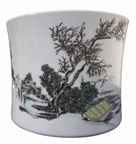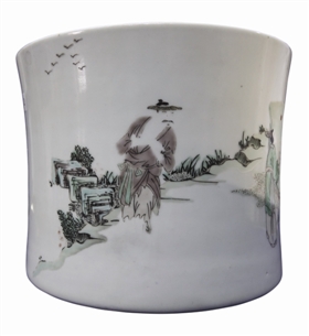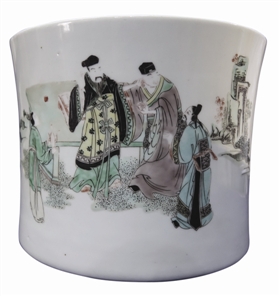 這只筆筒,也最能體現(xiàn)康熙古彩瓷紋飾與裝飾特色,山水人物層次鮮明,濃淡相宜,艷而不俗,人物姿情出神入化,有一種難能的雅致。小畫大道理,簡筆大意境,能夠巧妙地把人物與生活現(xiàn)實場景、人與人、與自然景色融為一體,使瓷畫在幾寸之間,彌散著豐富的生活情趣,表達了人們對美好生活的向往或?qū)θ嗽谋迵。這應該是康熙五彩瓷、古彩瓷的一大特點。有專家曾說,康熙古彩瓷以五色爭艷、富麗堂皇、高貴典雅、鐵線銀勾而居瓷畫藝術之首,以工藝嚴謹、形象概括、構圖新穎、古樸灑脫,而居釉上彩之大宗。此言不虛。